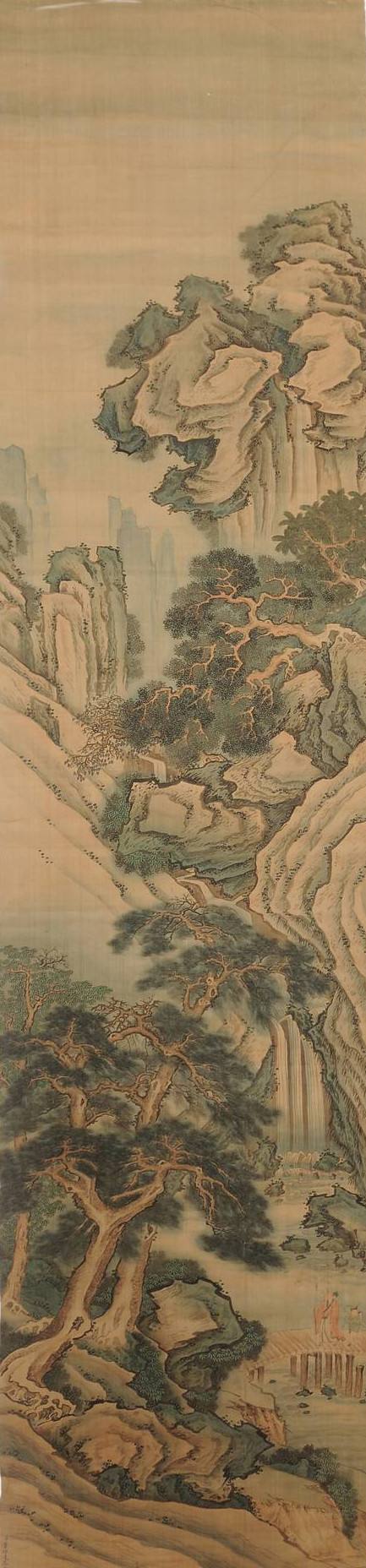 A、本作品的幅面規(guī)格大。均為立軸式畫幅,長*寬分別為2200*530毫米,與目前董邦達(dá)畫卷在對(duì)外展出和拍賣的作品相比較:本作品的幅面規(guī)格為最大的、屬罕見的。