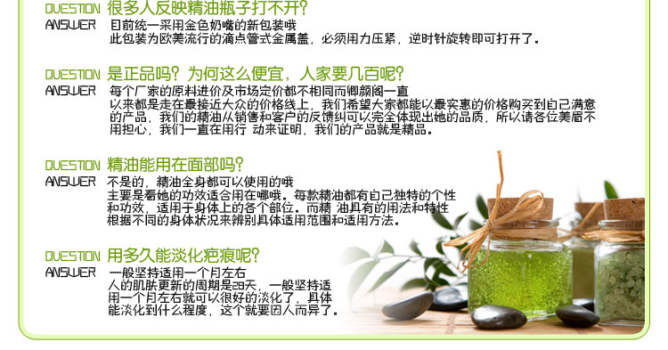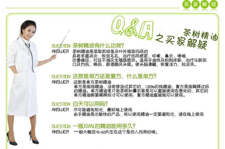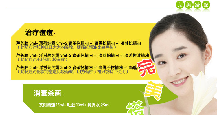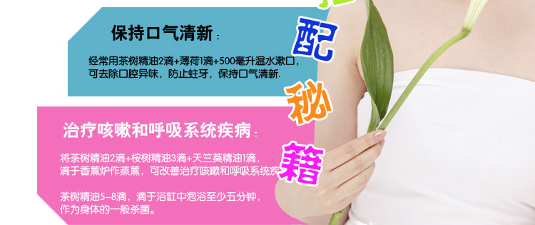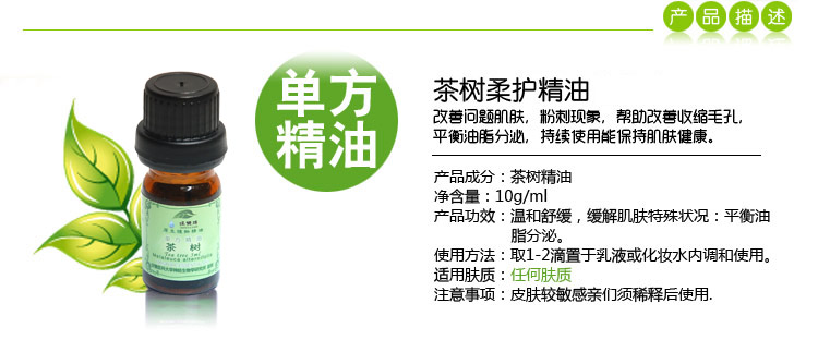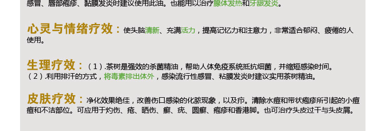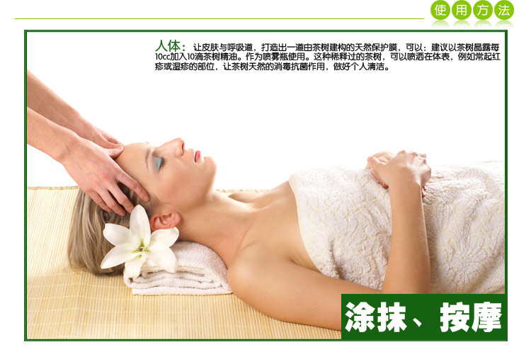 茶樹精油氣味清香獨特濃烈,它具有全天然的抗微生物活性、殺菌功效、抗菌活性、無刺激性、優良的皮膚滲透作用和獨特的芳香性等優點它可以治療-割破擦傷,用后傷口愈合奇快,止血力超強、粉刺暗瘡,青春痘、蚊叮咬、手腳癬等,對暈船暈車癥狀也有療效,可凝神。