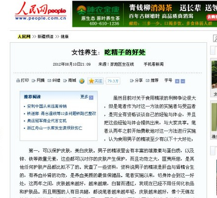 雖然目前對(duì)關(guān)于食用精液的利弊爭論很大,但是筆者作為對(duì)這一方法的實(shí)施者與受益者,是完全有資格談?wù)勛约旱慕?jīng)驗(yàn)與體會(huì),并且把這些經(jīng)驗(yàn)與體會(huì)提供出來,與大家共享。筆者從兩年之前開始勇敢地對(duì)這一方法進(jìn)行實(shí)施,認(rèn)為食用男子的精液至少有以下十大好處: